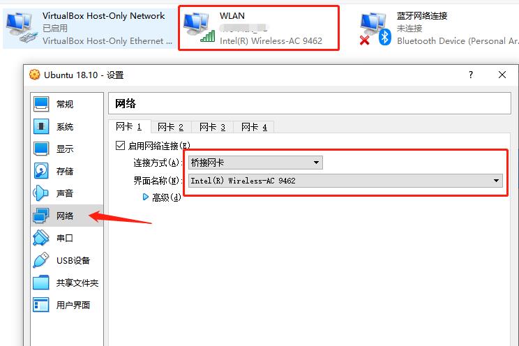 网络-网口1:设置成桥接网卡、界面名称选择对应的网卡名称,我电脑是走wifi网络的,所以选择wifi的网卡,如果是网线的,则选择对应的网卡即可。